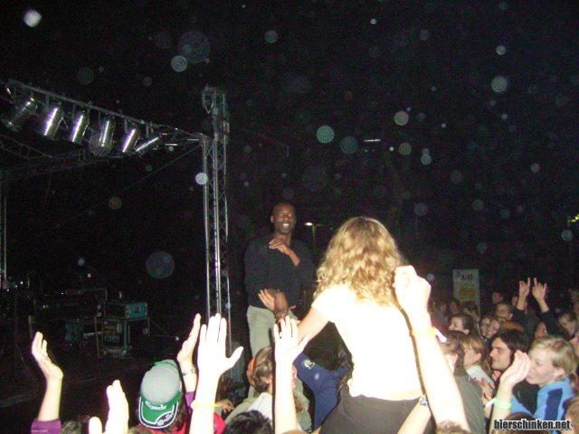 der Faaarbige versucht trotzdem weiter Stimmung zu machen, schafft er dann auch. Er besteigt diese "Graben"-Absperrungs-Dings-Gitter und animiert das Publikum zum mitsingen mit good old "sex machine"! yeah, get uppa
