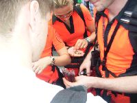 Auch angekommen is inzwischen Volker! der wird natürlich sofortamente beklebt, sozusagen als Aufnahmezeremonie