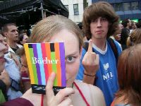 so allgemein is das Publikum ein wenig lahm. N paar Leute können n paar Texte, n paar tanzen sogar und der Rest steht so rum. nunja. Immerhin treff ich den Sänger von den Käferbananen, sorry Käfigbanausen, die ham ja immerhin "unkaputtbar" gecovert. Aber er hat keinen Iro mehr