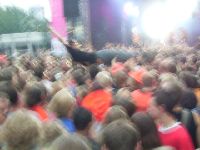 Seltsam, kaum wird die Kamera Richtung Bühne gerichtet, verwackelt alles. Vielleicht weil jetz grad Exilia spielen, auch sone Band die keiner braucht (ich jedenfalls nich), obwohl die ja Bonuspunkte wegen Frauenanteil kriegen. Naja aufm Foto zu sehen (klar zu erkennen) is jedenfalls Bulle beim Stagediven