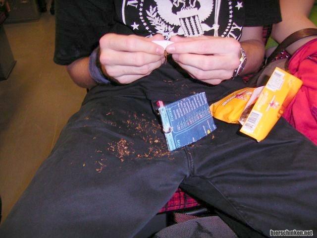 Hille versucht irgendwie, in seinem Zustand noch ne Kippe zu drehen. Wundert ihn garnich dasser dafür doppelt soviel Tabak verbraucht wie sonst