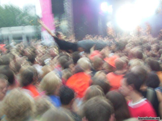 Seltsam, kaum wird die Kamera Richtung Bühne gerichtet, verwackelt alles. Vielleicht weil jetz grad Exilia spielen, auch sone Band die keiner braucht (ich jedenfalls nich), obwohl die ja Bonuspunkte wegen Frauenanteil kriegen. Naja aufm Foto zu sehen (klar zu erkennen) is jedenfalls Bulle beim Stagediven