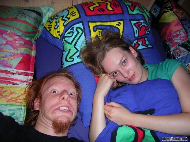 Fö und Britta im Bettchen. Übrigens is grad ca 3 Uhr. Keine Fotos hamwa leider von Volker, der danach noch total betrunken ankam, "sofort" wieder gehen wollte, komische Sachen sütterte, dann sowas sagte wie "ey wirtz tut mir herbe leid du musst ja morgen arbeiten ich geh jetz echt ma" - fuß aus tür - "ey hille du hastn aquarium? da fällt mir ne story ein, erzähl ich jetz, is echt wichtig!", ja blablaschwafel, um 4 geht er dann, 6 uhr mussich aufstehn und maloche blabla