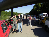 Ah, hier kann ich noch gar nicht besoffen gewesen sein, ich bin ja gefahren. Aber hätte ich, denke ich, lieber getan. Auf der Autobahn hindert uns eine Vollsperrung am weiteren Vorankommen. Na toll! Als wir gerade anfangen, unsere Grillutensilien auszupacken, werden wir zu irgendeiner Ausfahrt und irgendeiner Umfahrung gelotst.