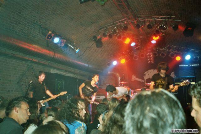 Die Band geht auch gut ab, der Gitarrist springt und rennt die ganze Zeit quer über die Bühne, die annern sind auch nich grade still - aber auch ihnen gelingt es trotz bitten und flehen nicht, das Publikum zu mehr als einem Kopfnicken zu animieren