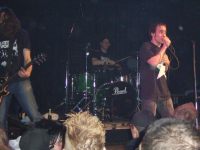 Nächste Band: Schrottgrenze! Und wie der Kollege so schön sagte, neben den Übermenschen die einzige Band ohne Asselfaktor. Oder? Sofort stürmen einige Leute auffe Bühne, ne junge Dame und ein junger Kerl, und ziehn sich aus. Sah bei der Dame besonders schön aus: Auffe Bühne - Hose auf - falschen Schritt gemacht - vonner Bühne gefallen. Und nochmal das Ganze, diesmal ohne Fallen.