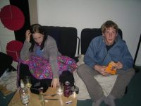 Draußen is ne Tanke mit Bier. Bier geholt, zum Nachtexpress gelaufen, nach Hause gefahrn, naja, doch nich nach Hause, mir fällt irgendwie ein dass bei Miriam ja noch Party is, die annern wolln nich mit, ich also dahin und komm grade rechtzeitig um die Gäste zu verabschieden. Schön. Aber Miriams Schwester und Jannik sind ja noch da