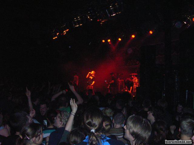 Ein asozialer Dreckspaten findet das Getümmel da vorne auch toll. So toll dass er ungefähr 10mal da hinrennt, wohl immer wenn n neuer Song kommt. Dann 30 Sekunden lang Pogo, um zu zeigen wie man den Song mag und wieder nach hinten. Und dann hoppla, n neuer Song! Klingt ja auch toll! Also wieder nach vorne. Man könnte ja was vom Pogo verpassen, also so schnell wie möglich nach vorne und dabei möglichst dem Fö auf seinen kaputten Fuß latschen.