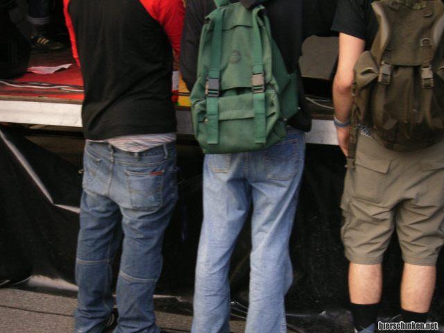 Diese drei mutigen Typen schaffens sogar bis direkt anne Bühne, freuen sich über die Schilder dass man die Bühne nich betreten soll und müssten sich mal die Hosen hochziehen.