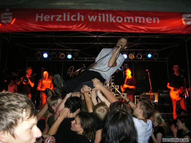 Zurück zur Bühne, da gibts inzwischen ne Zugabe und Üni hat ganz Beatsteaks-Like n Gitarrenkoffer aufs Publikum geschmissen und setzt sich drauf. Klappt sogar! Nur hinstellen sollte er nich versuchen...er schaffts sogar sich auf der Box umzudrehen und dabei weiterzusingen, viel bewegen tun sich die Leute unter ihm aber nich weil sind eh n paar wenig da die ihn festhalten...der Rest macht Fotos mit Handykameras