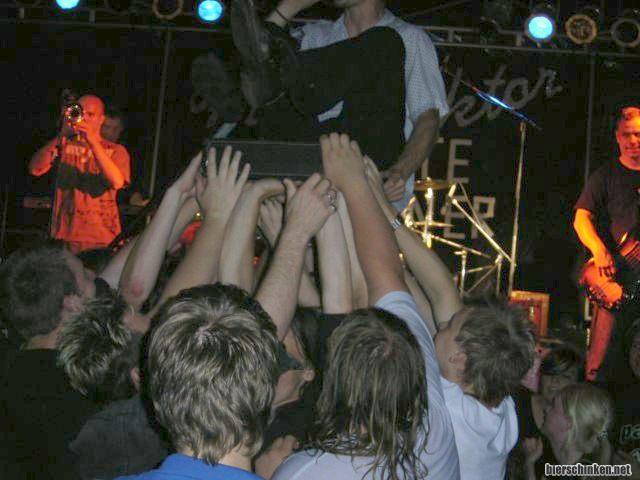 Oder zieht ihm die Schuhe aus. Einen Schuh hamse schon und den zweiten Fuß hamse auch schon festgehalten, kanner grad noch zurückziehen. Dann geht er aber irgendwann zurück auffe Bühne. Und da fragt er auch irgendwann nach seinem Schuh und will dem Typen ne CD geben der ihm den Schuh wiedergibt, habbich dann aber nich weiter verfolgt
