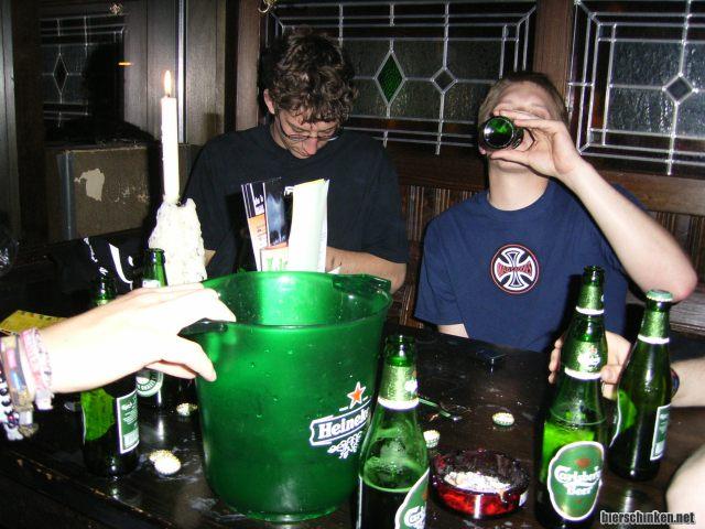 Dort befinden sich nämlich Helena und Martin! Die hams nich mehr nach Hattingen geschafft, machen aber trotzdem upp mitn paar weiteren munteren Gesellen. Und da kommenwa dazu! Da gibbet sonen Heineken-Eimer wie man ihn da sieht mit Eiswürfeln und 6 Flaschen Bier gefüllt sowie n Carlsberg-Shirt dazu. Da hatten die schon einen von also nehmenwa noch einen. Das Shirt darf man behalten, den Eimer nich. VERDAMMT!