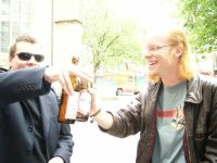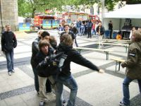 So, danach wirds wieder Zeit für die Sticks'n'Stones, darf nämlich jede Band heute mal mit zwei Sets dran. Zwischendurch immer mal gelockert durch tolle Rap-Einlagen oder den deutschen Meister im Hackysack. Oder durch den pseudolustigen Moderator, der sich vonner Feuerwehr vonner Reinoldikirche abseilen lässt