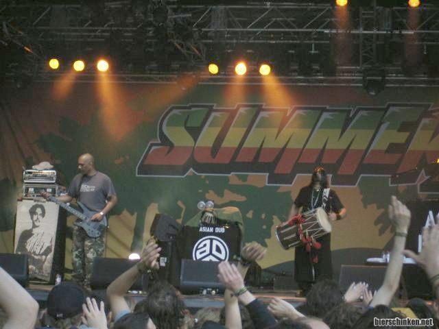 Dafür hat der Bassist von denen auch wieder son Bass ohne Kopf, muss wohl irgendwie Mode sein, find ich auch wieder ganz lustig. Ja, dat war die Asian Dub Foundation! Wollt ich eh schon ewig mal sehn und der Hö ja auch, nu hamwas geschafft. Mir wie gesacht zu elektronisch, trotzdem geil!