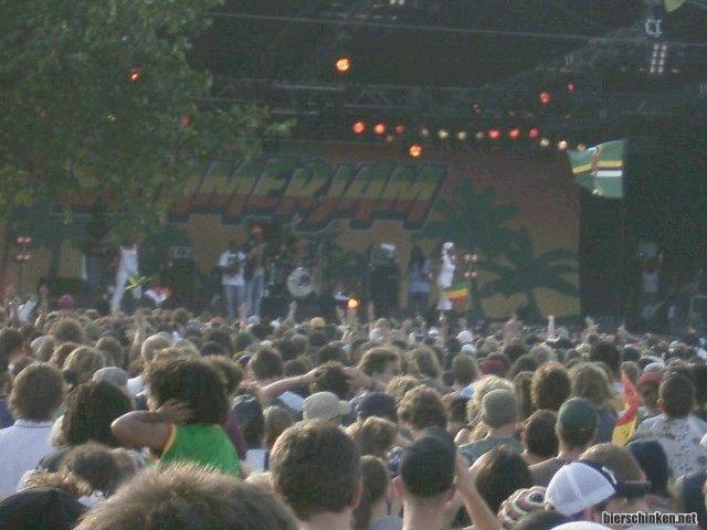 Eigentlich wollten wir zum Zelt und was essen, sind dann aber anner roten Bühne vorbei und da spielt nun grad Anthony B, hört sich ganz nett an weil mal wat lebhafter und nich so lahme Hippiekacke, also schaunwa uns das mal von etwas weiter hinten an