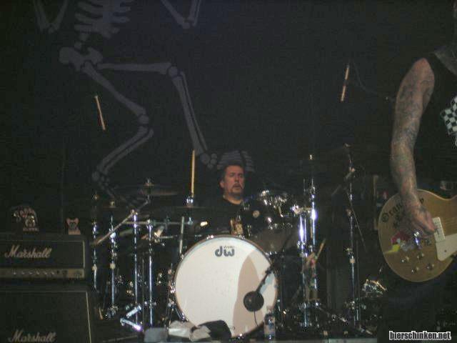 Da geht doch wirklich die Band ganz unter, alles konzentriert sich auf Mike Ness, auf jede kleinste seiner Bewegungen, wie er da steht, wie er die Gitarre hält und was für Augen er hat - Social Distortion ist Mike Ness. Möchte man meinen. Aber da gibts noch mehr. Drummer Charlie Quintana, der Mexikaner wie Mike Ness ihn betitelt. Kantiges Gesicht. Wer achtet schon auf Schlagzeuger?
