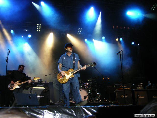 So, der Grund, weshalb wir hier sind: Das ist Mike Ness in sehr fescher ähm, Uniform. Kaum ham die das erste Lied (Riiich for se Skai) gespielt, wurd mein Brustkorb schon sehr arg von sehr großen und breiten Rockabillies zusammengedrückt, aua.