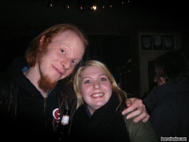 Also rein! 5 Euro Eintritt, Bier kost nen Euro und vegane Pampe für lau. Und wir kriegen nichmal Gruppenrabatt, obwohl wir die anscheinend die einzigen zahlenden Gäste sind. Kiki ergreift die Gelegenheit, sich auch mal mit der Kamera zu beschäftigen. Und hier sieht man Fö und Sonja, Sonja hat son lustigen leeren Blick.