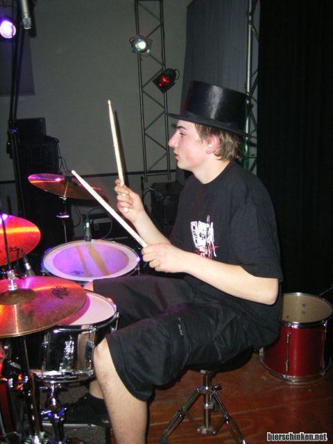 Schlagzeuger Hank! Hat nen lustigen Hut auf, so wie die Totengräbern in den Westernfilmen, die immer auftauchen, nachdem Hank gehängt wird. Ja, den musste ich jetz bringen! Was mir grad so einfällt, ham die wirklich den Lokenbach-Song in der Originalversion gespielt? Mit Schubbert und so? War glaubich so. Oder ich hab nur falsch mitgesungen.