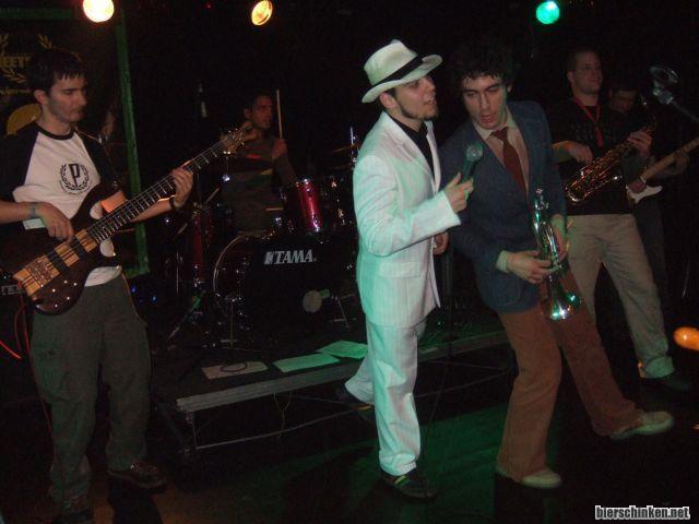 Und wieder ohne Gast. Dafür darf der Trompetenmann auch mal ins Mikro singen, wahrscheinlich Refrain oder so, hehe. Allgemein viel Bewegung auf der Bühne, das gefällt mir. Auch wenn der Bass hier aufm Bild zu hoch hängt, aber is wohl bei Skabands so üblich.