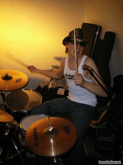 Phil mit dem schönsten Oberteil des heutigen Abends! Ne, kein Wonderbra, ein Unterhemd von BETRUNKEN IM KLAPPSTUHL! Die spielen übrigens am 6.5. mit Delikat, Lili und Gedankenflucht in Dortmund-Scharnhorst, wer da nich hingeht verpasst die Geburt der neuen Band der Stunde!
