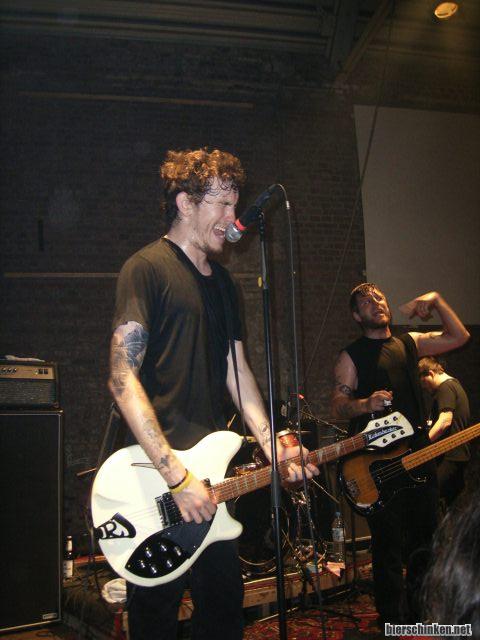 Keeeine Ahnung wat der Bassist da hinten macht. Sänger schreit sich einen ab und der steht da, dreht Däumchen (oder Zeigefinger) und trinkt Bier. Muss auch mal sein.