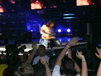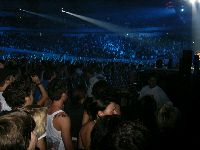 Weil wir so alte Haudegen sind komm ich trotz Sitzplatzkarte in den Innenraum, ha wär doch gelacht, und da spielt die Vor-"Band": Dizzee Rascal oder so, und es is Hip Hop! Gehts noch schlimmer? ein Plattendreher und zwei Räpper wuseln da auf der Bühne rum. Absolut nich unser Ding, auch wenn ich das eingesampelte Strokes-Riff ganz geil find. Ansonsten is aber zumindest vorne gut Stimmung.