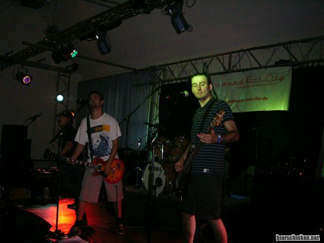 Die Musik is so Westcoastskatepunk trifft auf Skandinavienrocknroll. Ungefähr. Größtenteils englische Texte, wat deutsches war auch dabei (das erinnerte mich plötzlich total an Lightkultur) und die fleißigen Musikanten wechseln auch mal Instrumente. Als wir ankamen stand Michi hier am Bass, inzwischen steht der da drüben anner Gitarre.