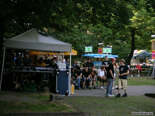 Die Mischer ham da aber son Laptop aufgebaut wo sie sich das Spiel angucken, da stellt Catti dann auch einfach ne Bank hin und guckt mit. Nach kurzer Zeit Stehen da zwei Bänke undn paar mehr Leute sind auch da. Die nächste Band heißt Kleinstadthelden, Musik is so wie der Name, nich grad sehr abwechslungsreich das Programm heute...