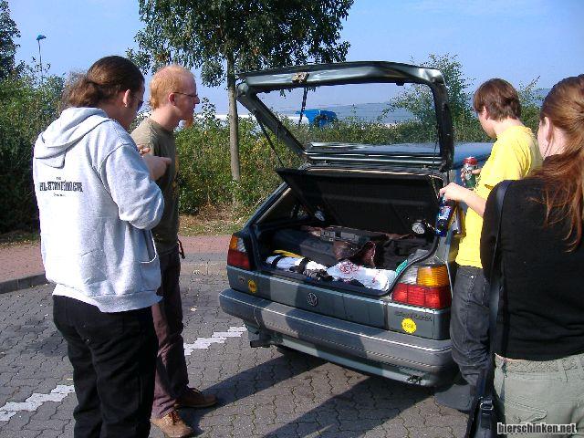 Also schon Donnerstag früh los! Ich bin eh schon wach weil muss die Handwerker für die neue Kellertreppe beaufsichtigen. Total spannende Aktion. Irgendwann schwing ich mich dann aber ins Auto, schnell die annern abholen, als Verpackungsspezialist isset natürlich kein Problem, all das Gepäck zu verstauen - wir sind nämlich fünf Leute: Fö, CATTi, Sonja, Christina und Phil geben sich die Ehre