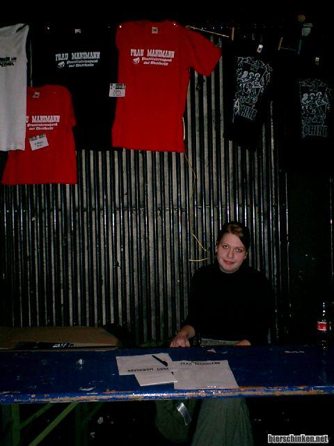 Sonja darf heute den Merchstand übernehmen, weil Frauen am Merch einfach mehr hergeben und mehr bekommen. Mehr Geld. Frau Mansmann haben schicke neue T-Shirts mit der passenden Beschreibung "Prostituiertenpunkrock aus Westberlin" drauf. Wir kapern den Stand und hängen unsere Betrunken-im-Klappstuhl-Unterhemden auf, können sogar 3 verkaufen. Yeah!