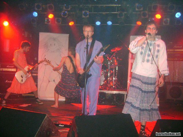 Bald legt dann die erste Band los: Frau Mansmann! Warum denn nicht als Headliner? Unverständlich! Als Intro gibbet irgendwas endlos langes mit nem super "Flughafen Flughafen"-Refrain, muss man sich erstmal erlauben können mit so kurzer Spielzeit auch nochn Intro ertönen zu lassen.