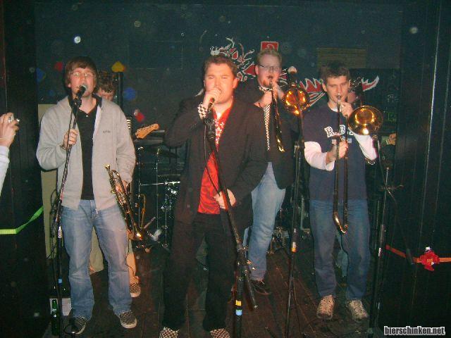 Die erste Band ham wir durch die Geschehnisse rund um den Pizzaladen verpasst, No Mute waren das, auch schonmal gesehen. Laut Aussagen einiger, die sie gesehen haben, eher ein durchschnittlicher Auftritt, außer das alle verwundert waren, dass sie tatsächlich Filmriss gecovert haben. Tja, sowat gehört sich! Die nächste Band tut das nicht, aber schau ich mir trotzdem mal an: Die Awesome Scampis, Ska aus Bergkamen