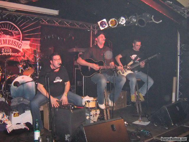 Wir kommen zwar deutlich später an als geplant aber immer noch früh genug, um die anwesenden Idioten zu begrüßen. Irgendwann dann rein, es gibt kein Bier, nur Kölsch. Immerhin ein spezielles Helios-Geburtstagsbier. Würzig. 2 Euro. Nunja, erste Band spielt: Schmeisig! Neue/alte Band von Raki, Akustikgitarren-Country-Biertrinken-Musik