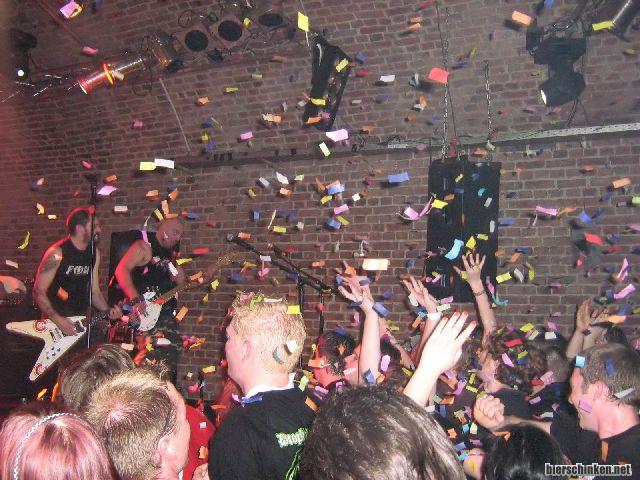 Und die Konfettikanone darf auch nicht fehlen! Party! Kamelle! Olé! Sehr geil, das Publikum nur noch ein einziger schwitzender und pogender Haufen. Ich bin froh dass hier am Rand noch etwas kühlerer Luftzug vom Bier-Kühlschrank is
