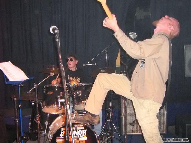 Und Bass ? Bässer - am aller Bässten: Fö! Man konnte ihn beobachten, wie er mit nur einer Hand den bekannten Song von McHammer (Can?t Touch This) anstimmte ? nicht ohne zu vergessen dabei mit der anderen Hand Bier zu trinken! (So, das sollte wohl reichen. Mehr Lobhudelei gibt es für ein Freibier nicht!!) Das kurze und bündige Set enthielt nach Ulfs Aussage 9 Songs ? mir kam es so kurzweilig wie 8 vor! Dreimal der Superhit Lili! Yeah!