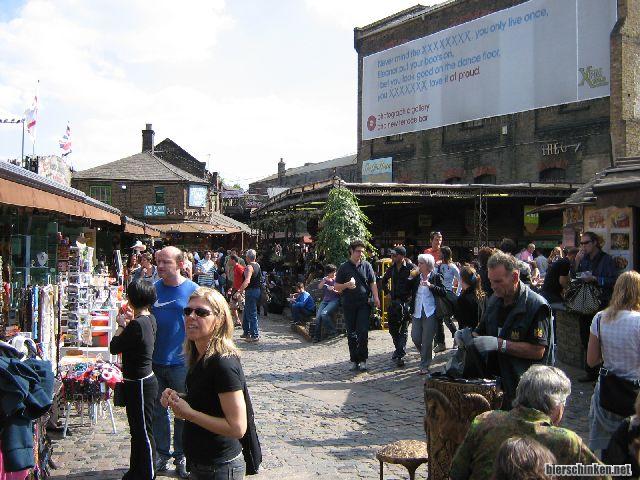 Erstes Ziel für uns: Der Camden Market. Ich weiß, waren wir Montag schon, aber am Wochenende ham da noch ein paar mehr Stände offen. Außerdem laufen mehr Leute rum. Paradies für Taschendiebe und so. Lebhafter Markt mit vielen interessanten Ständen. Aber sobald man einmal zu viel guckt, wird man von sämtlichen Verkäufern angelabert, drum trag ich heute Sonnenbrille.