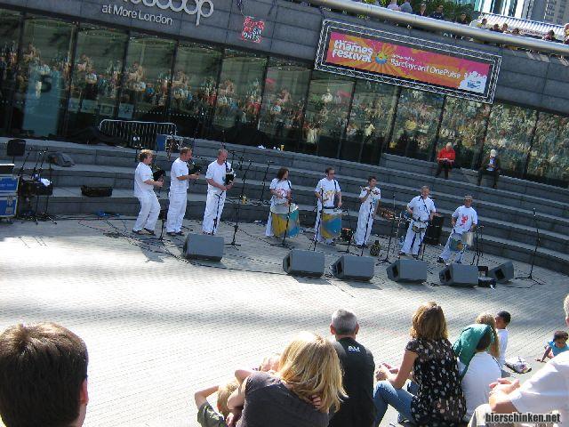 Weiter an die gegenüberliegende Seite der Stadt. Und der Themse. Hier findet nämlich das zweitägige Thames Festival statt, mit über 20 Auftrittsorten - aber nur 3-4 verschiedenen Bands. Eine davon: MacUmba. Brasilianischer Samba mit schottischem Dudelsack, interessante Mischung
