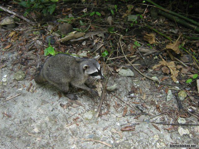 Einer der Höhepunkte: Ein Waschbär überquert den Weg und jagt Eidechsen, dabei lässt er sich von uns nicht aus der Ruhe bringen.