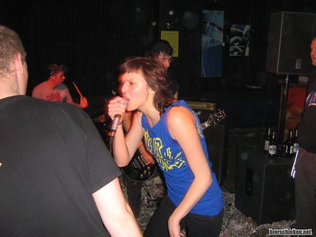 Singen tut hier eine Frau, also wat heißt singen, Schreien nennt sich das. Hat auch ein recht stabiles Organ. Allerdings is das hier wohl ihr letzter Auftritt, weil sie und der Drummer aussteigen. Das Publikum is wieder etwas weniger geworden, aber die paar die vor der Bühne stehen feiern noch kräftig mit