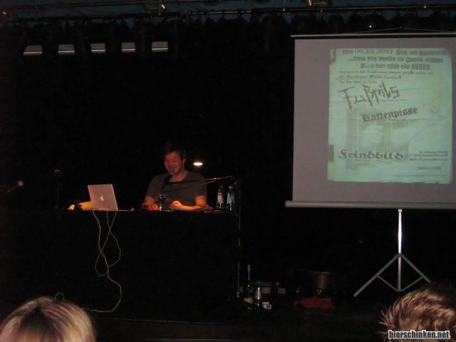Weiter geht's dann mit einer kurzen Pause, in der wir uns endlich Bier holen können. Während der Lese gibts nämlich anner Theke nix, na sowat. Anschließend darf dann Nagel wieder vorne sitzen. Multimedial etwas fortgeschrittener zeigt er uns nen Flyer mit Bands wie "Fußpils", "Rattenpisse" und "Feindbild". Großartig.