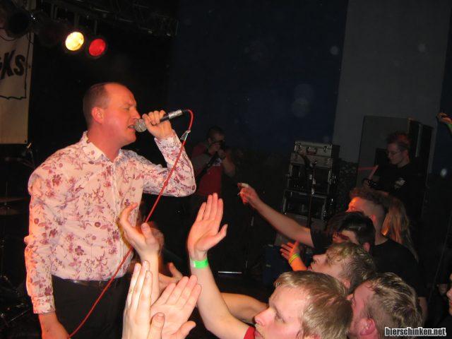 Das Publikum feiert gut mit, wie schön. Is anscheinend sowieso alles vertreten, was so an Asselpunk in Waltrops weiterer Umgebung rumläuft. Und ungefähr jeder zweite ist über meinen Pullover irritiert, kann ich absolut nich verstehen. Nur weil da kein Anarchie-A drauf is oder wat? Nennt mich Mister C&A