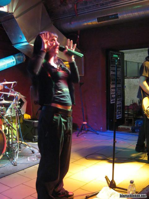 Total großartig finde ich das Kommunikationsproblem! Letztes Jahr in Berlin waren Ansagen auf spanisch kein Problem, aber heute kapiert die keiner, und englisch ist auch nicht grad verbreitet in der Band. Kommunikation mit Publikum und Lichtmischer gerät zur Farce. Immerhin versucht die Sängerin, ihre Texte durch entsprechende Gesten an den Mann zu bringen.