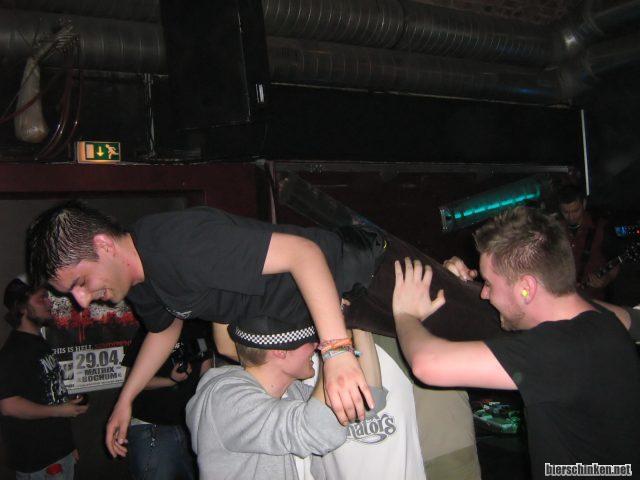Ein verzweifelter Fan wagt gar zwei Stagediving-Versuche. Die klappen auch mehr oder weniger, aber von Diving kann hier nicht die Rede sein, da es ja schließlich nur die anderen 4 Leute sind, die ihn quer durch den Raum tragen.