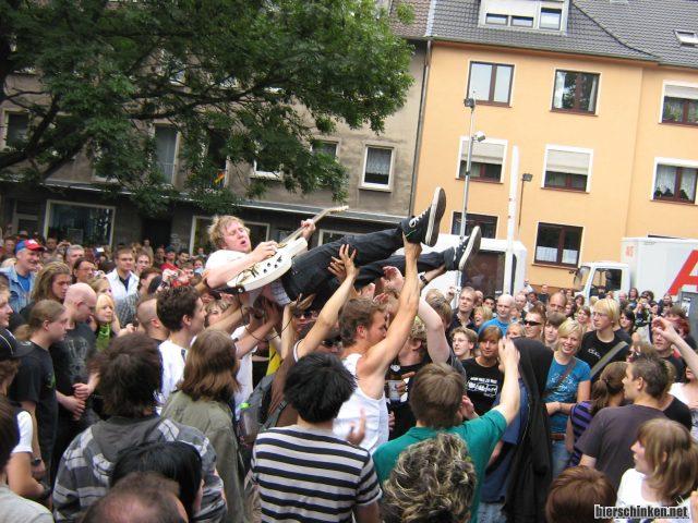 Aber wirklich größer, da wird deutlich mehr geboten, mit viel Spaß inne Backen. Einmal durchs Publikum tragen lassen is genauso drin wie ein Höllensprung vom Container. Geile Show, Publikum is auch gut drauf, zumindest lässt den Gitarristen niemand auf den Boden fallen.