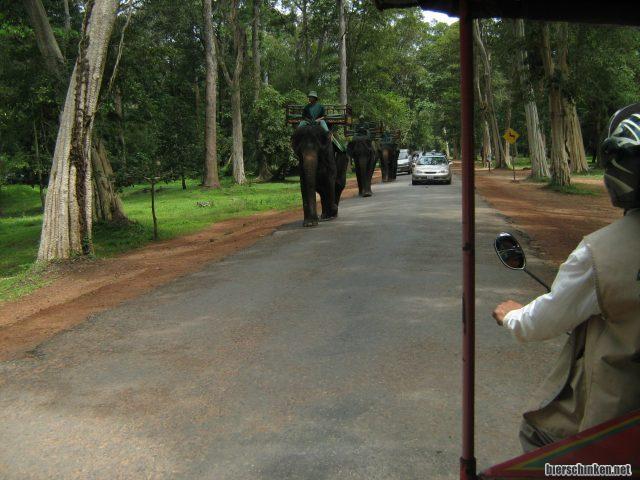 Auf dem Weg zum nächsten Tempel kommen uns kurzerhand ein paar Elefanten entgegen. Ein Verkehrsmittel wie hierzulande das Fahrrad, nur wird es nicht so oft geklaut.