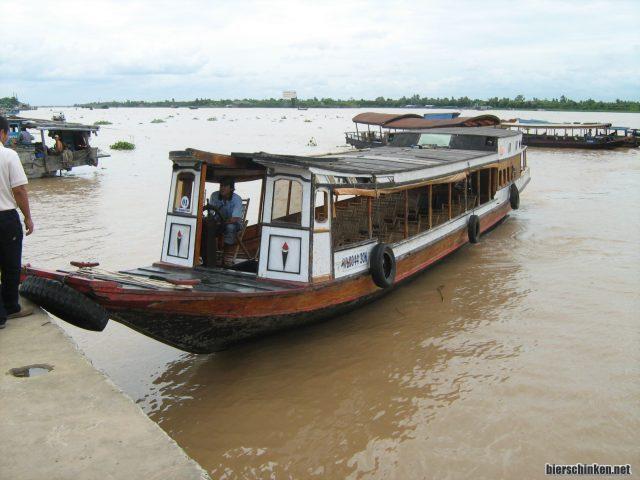 Der Bus bringt uns nach Cai Be, wo wir das erste Mal wirklich auf den Mekong treffen. Wir besteigen ein Boot und besichtigen die schwimmenden Märkte