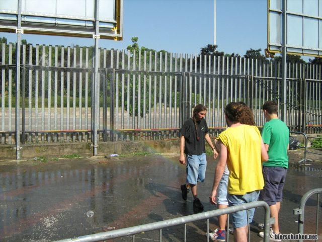 Puh, wieder raus. Vor der Halle sind diverse Stände aufgebaut, auch eine Freiluftdusche wartet darauf, die Massen zu kühlen. Blöd geregelt: Es gibt weder Stempel noch Bändchen, also muss man die gesamte Zeit auf dem Gelände verbringen. Ganz schön nervig bei 12 Stunden Programm.