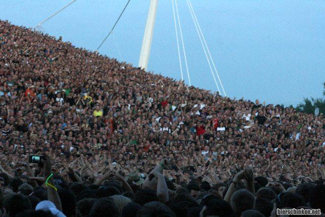 Als wir auf dem Weg in den Fotograben waren, wurden wir von der Security regelrecht angebrüllt. Alle Fotografen müssen raus, auf Anordnung vom Securitychef der Band die gleich spielen soll. Stattdessen durften wir nu zwischen den Wellenbrechern stehen, und nichtmal auf die Podeste durften wir drauf. Nun...es gibt nunmal Bands, die haben halt Sonderregeln...und ganz besonders das...