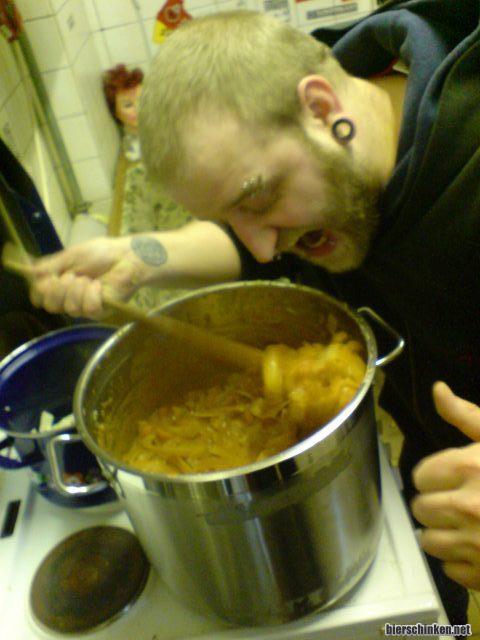 Zwei Ska-Bands mit Bläsern und Roadcrew bedeutet, dass wir Futter für 18 Leute machen müssen, uns selber mal nicht mitgerechnet. Da immer ein paar Vegetarier oder Veganer dabei sind, gibt es natürlich fleischlose Kost, von Chris üblicherweise liebevoll "Pampe" genannt. Es gibt Grünkohl mit Erdnusssauce und Möhrchen. Gar nicht schlecht eigentlich, und genug für alle.